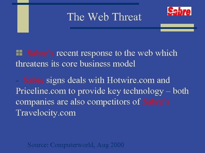 The Web Threat Sabre’s recent response to the web which threatens its core business model - Sabre signs deals with Hotwire. com and Priceline. com to provide key technology – both companies are also competitors of Sabre’s Travelocity. com Source: Computerworld, Aug 2000