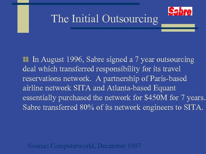 The Initial Outsourcing In August 1996, Sabre signed a 7 year outsourcing deal which transferred responsibility for its travel reservations network. A partnership of Paris-based airline network SITA and Atlanta-based Equant essentially purchased the network for $450 M for 7 years. Sabre transferred 80% of its network engineers to SITA. Source: Computerworld, December 1997