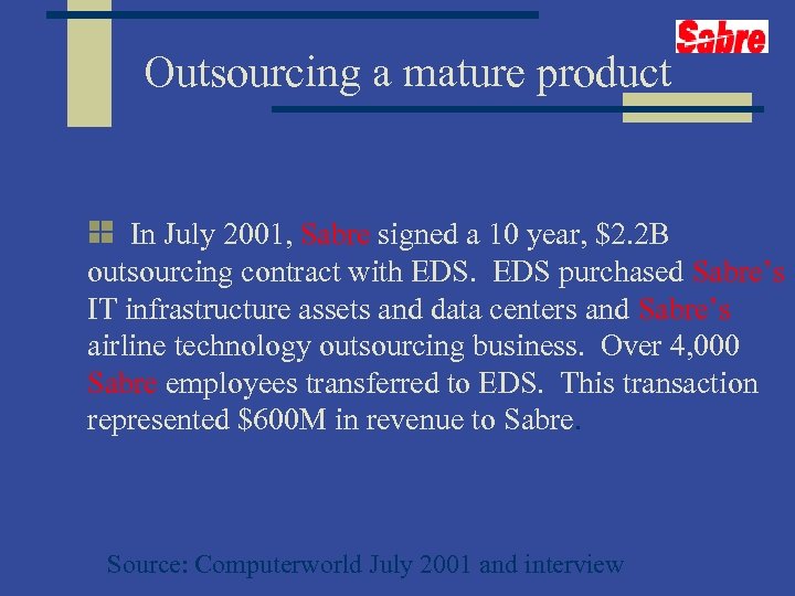 Outsourcing a mature product In July 2001, Sabre signed a 10 year, $2. 2 B outsourcing contract with EDS purchased Sabre’s IT infrastructure assets and data centers and Sabre’s airline technology outsourcing business. Over 4, 000 Sabre employees transferred to EDS. This transaction represented $600 M in revenue to Sabre. Source: Computerworld July 2001 and interview