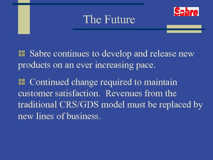 The Future Sabre continues to develop and release new products on an ever increasing pace. Continued change required to maintain customer satisfaction. Revenues from the traditional CRS/GDS model must be replaced by new lines of business.