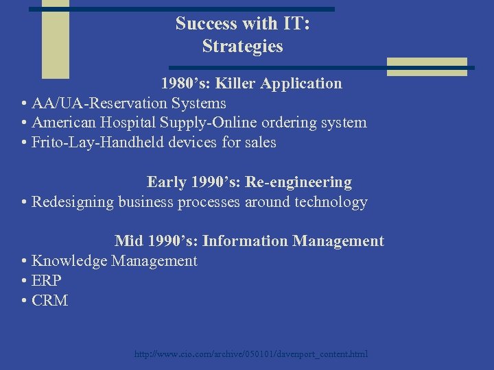 Success with IT: Strategies 1980’s: Killer Application • AA/UA-Reservation Systems • American Hospital Supply-Online ordering system • Frito-Lay-Handheld devices for sales Early 1990’s: Re-engineering • Redesigning business processes around technology Mid 1990’s: Information Management • Knowledge Management • ERP • CRM http: //www. cio. com/archive/050101/davenport_content. html