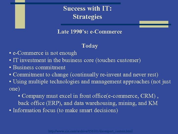 Success with IT: Strategies Late 1990’s: e-Commerce Today • e-Commerce is not enough • IT investment in the business core (touches customer) • Business commitment • Commitment to change (continually re-invent and never rest) • Using multiple technologies and management approaches (not just one) • Company must excel in front office(e-commerce, CRM) , back office (ERP), and data warehousing, mining, and KM • Information focus (to make smart decisions) http: //www. cio. com/archive/050101/davenport_content. html