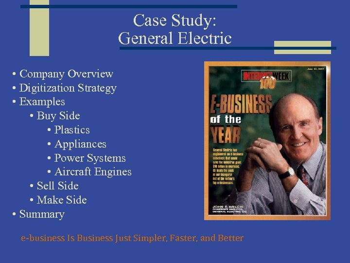 Case Study: General Electric • Company Overview • Digitization Strategy • Examples • Buy Side • Plastics • Appliances • Power Systems • Aircraft Engines • Sell Side • Make Side • Summary e-business Is Business Just Simpler, Faster, and Better