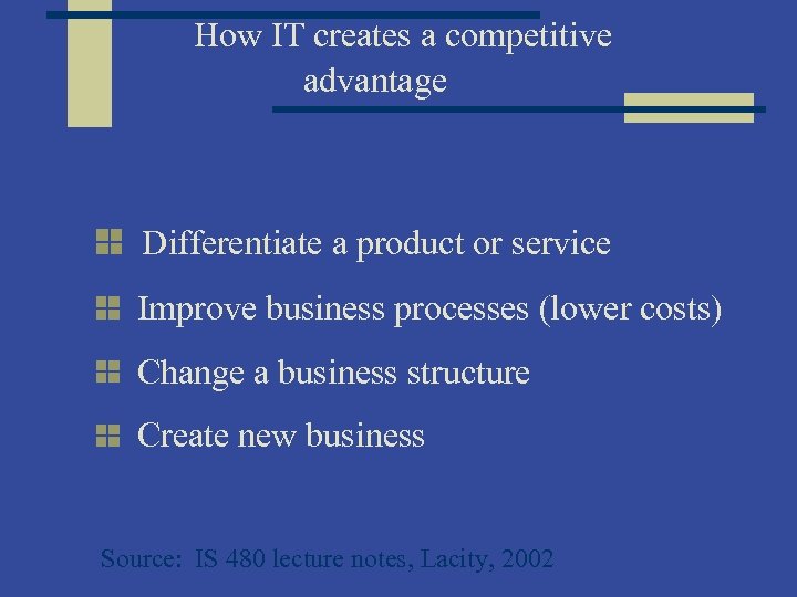 How IT creates a competitive advantage Differentiate a product or service Improve business processes (lower costs) Change a business structure Create new business Source: IS 480 lecture notes, Lacity, 2002