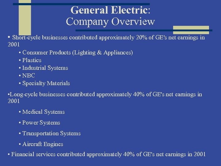 General Electric: Company Overview • Short-cycle businesses contributed approximately 20% of GE's net earnings in 2001 • Consumer Products (Lighting & Appliances) • Plastics • Industrial Systems • NBC • Specialty Materials • Long-cycle businesses contributed approximately 40% of GE's net earnings in 2001 • Medical Systems • Power Systems • Transportation Systems • Aircraft Engines • Financial services contributed approximately 40% of GE's net earnings in 2001