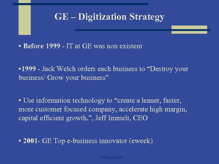 GE – Digitization Strategy • Before 1999 - IT at GE was non existent • 1999 - Jack Welch orders each business to “Destroy your business/ Grow your business” • Use information technology to “create a leaner, faster, more customer focused company, accelerate high margin, capital efficient growth. ”, Jeff Immelt, CEO • 2001 - GE Top e-business innovator (eweek) www. ge. com