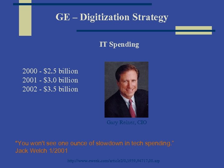 GE – Digitization Strategy IT Spending 2000 - $2. 5 billion 2001 - $3. 0 billion 2002 - $3. 5 billion Gary Reiner, CIO "You won't see one ounce of slowdown in tech spending. ” Jack Welch 1/2001 http: //www. eweek. com/article 2/0, 3959, 94717, 00. asp