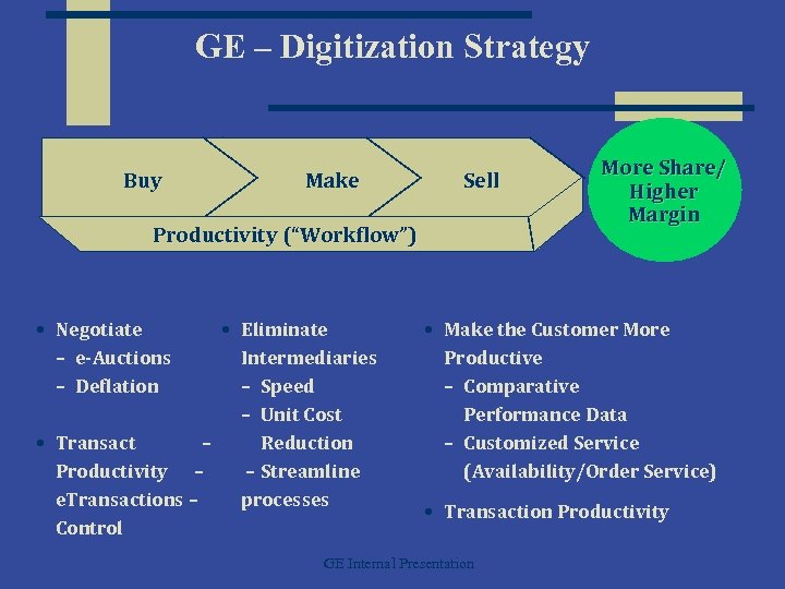 GE – Digitization Strategy Buy Make Sell Productivity (“Workflow”) • Negotiate – e-Auctions – Deflation • Eliminate Intermediaries – Speed – Unit Cost • Transact – Reduction Productivity – – Streamline e. Transactions – processes Control More Share/ Higher Margin • Make the Customer More Productive – Comparative Performance Data – Customized Service (Availability/Order Service) • Transaction Productivity GE Internal Presentation