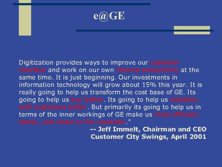 e@GE Digitization provides ways to improve our customer interface and work on our own internal productivity at the same time. It is just beginning. Our investments in information technology will grow about 15% this year. It is really going to help us transform the cost base of GE. Its going to help us buy better. Its going to help us interface with customers better. But primarily its going to help us in terms of the inner workings of GE make us more efficient, leaner, and closer to the customer. " -- Jeff Immelt, Chairman and CEO Customer City Swings, April 2001