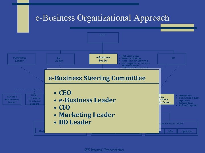 e-Business Organizational Approach CEO Marketing Leader e-Business Leader BD Leader • • High Level Leader Knows the Business Track Record of Delivering Well Respected - Great Team Player/Influencer • Understands Commercial & Operations • Has or Can Play on Business Leader Staff CIO e-Business Steering Committee Buy Side e-Commerce Leader Other e-Business Functional Leaders • • • CEO e-Business Leader CIO Marketing Leader BD Leader DYB. com/GYB. com Leader Focus: Destroy Your Business/ Grow Your Business Cross Functional Team Marketing Sales Operations • • • External or Internal Internet Generation Creative, Entrepreneurial Start Up Experience Marketing/IT Background CWC. com Leader Focus: Enhance & Build Your Customer Web Center Chief Architect. Com Technical Team Technical Functionality Back End Infrastructure GE Internal Presentation • External Hire • e-Commerce Industry Experience • Business Savvy • Technical Expertise Cross Functional Team Marketing Sales Operations
