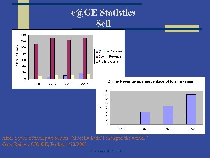 e@GE Statistics Sell After a year of trying web sales, “it really hadn’t changed the world. ” Gary Reiner, CIO GE, Forbes 4/30/2001 GE Annual Reports