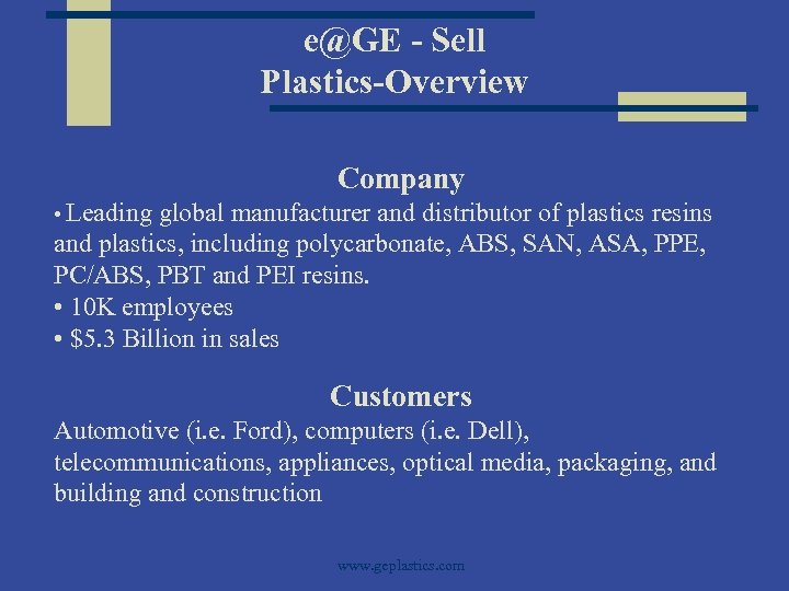 e@GE - Sell Plastics-Overview Company • Leading global manufacturer and distributor of plastics resins and plastics, including polycarbonate, ABS, SAN, ASA, PPE, PC/ABS, PBT and PEI resins. • 10 K employees • $5. 3 Billion in sales Customers Automotive (i. e. Ford), computers (i. e. Dell), telecommunications, appliances, optical media, packaging, and building and construction www. geplastics. com