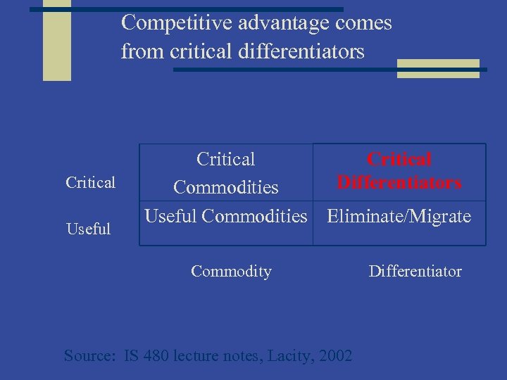 Competitive advantage comes from critical differentiators Critical Useful Critical Differentiators Commodities Useful Commodities Eliminate/Migrate Commodity Source: IS 480 lecture notes, Lacity, 2002 Differentiator
