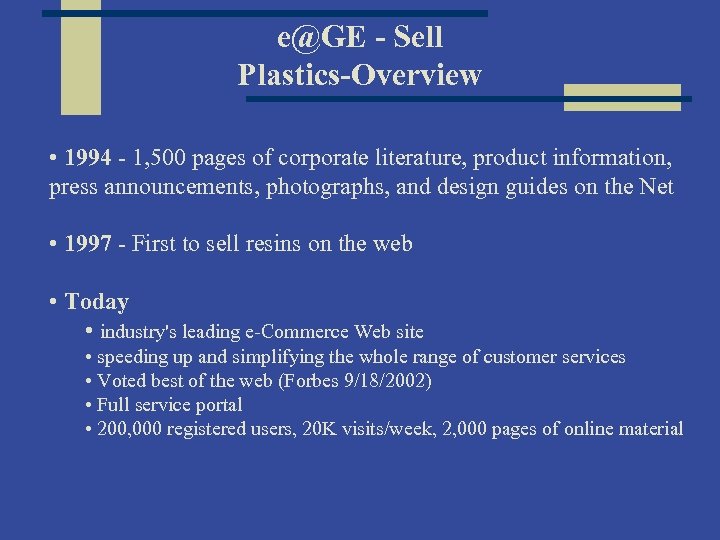 e@GE - Sell Plastics-Overview • 1994 - 1, 500 pages of corporate literature, product information, press announcements, photographs, and design guides on the Net • 1997 - First to sell resins on the web • Today • industry's leading e-Commerce Web site • speeding up and simplifying the whole range of customer services • Voted best of the web (Forbes 9/18/2002) • Full service portal • 200, 000 registered users, 20 K visits/week, 2, 000 pages of online material