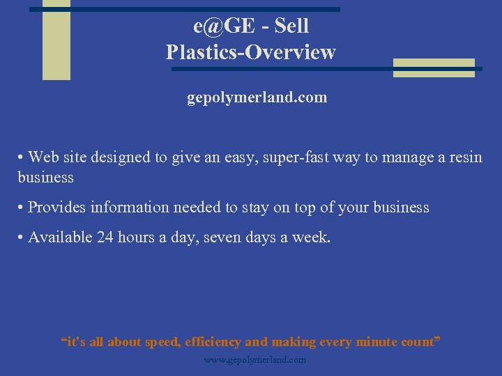 e@GE - Sell Plastics-Overview gepolymerland. com • Web site designed to give an easy, super-fast way to manage a resin business • Provides information needed to stay on top of your business • Available 24 hours a day, seven days a week. “it's all about speed, efficiency and making every minute count” www. gepolymerland. com