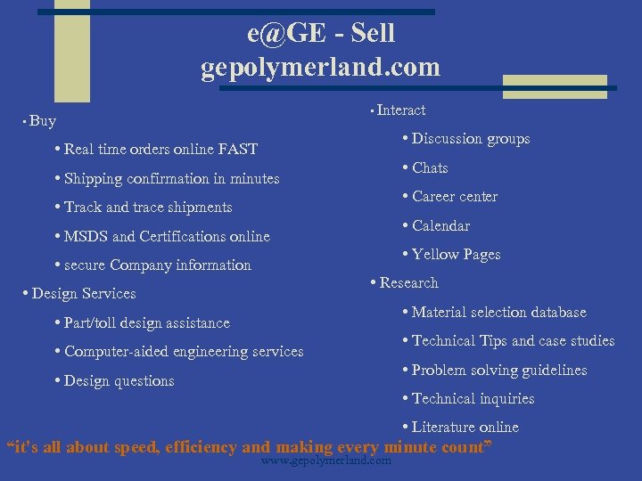 e@GE - Sell gepolymerland. com • Interact • Buy • Discussion groups • Real time orders online FAST • Chats • Shipping confirmation in minutes • Career center • Track and trace shipments • Calendar • MSDS and Certifications online • secure Company information • Yellow Pages • Research • Design Services • Material selection database • Part/toll design assistance • Computer-aided engineering services • Design questions • Technical Tips and case studies • Problem solving guidelines • Technical inquiries • Literature online “it's all about speed, efficiency and making every minute count” www. gepolymerland. com