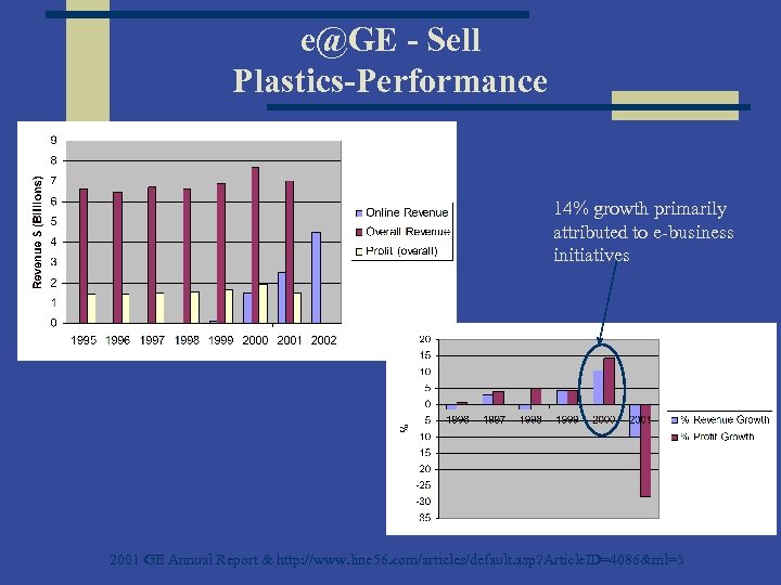 e@GE - Sell Plastics-Performance 14% growth primarily attributed to e-business initiatives 2001 GE Annual Report & http: //www. line 56. com/articles/default. asp? Article. ID=4086&ml=3
