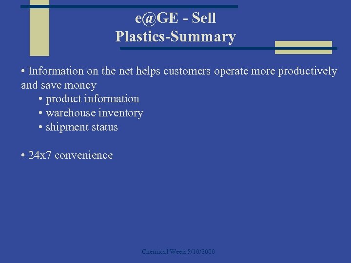 e@GE - Sell Plastics-Summary • Information on the net helps customers operate more productively and save money • product information • warehouse inventory • shipment status • 24 x 7 convenience Chemical Week 5/10/2000