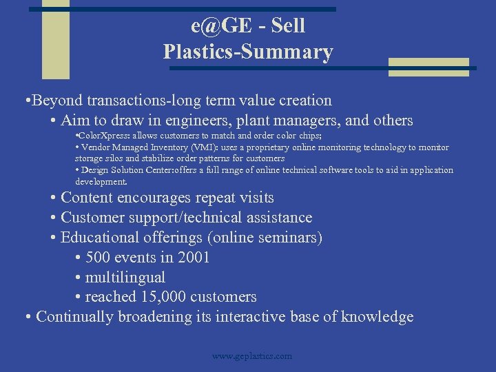 e@GE - Sell Plastics-Summary • Beyond transactions-long term value creation • Aim to draw in engineers, plant managers, and others • Color. Xpress: allows customers to match and order color chips; • Vendor Managed Inventory (VMI): uses a proprietary online monitoring technology to monitor storage silos and stabilize order patterns for customers • Design Solution Center: offers a full range of online technical software tools to aid in application development. • Content encourages repeat visits • Customer support/technical assistance • Educational offerings (online seminars) • 500 events in 2001 • multilingual • reached 15, 000 customers • Continually broadening its interactive base of knowledge www. geplastics. com