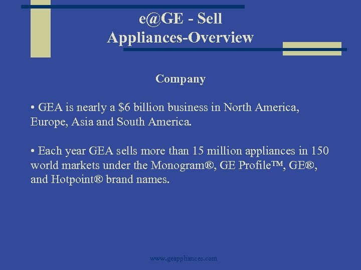 e@GE - Sell Appliances-Overview Company • GEA is nearly a $6 billion business in North America, Europe, Asia and South America. • Each year GEA sells more than 15 million appliances in 150 world markets under the Monogram®, GE Profile™, GE®, and Hotpoint® brand names. www. geappliances. com