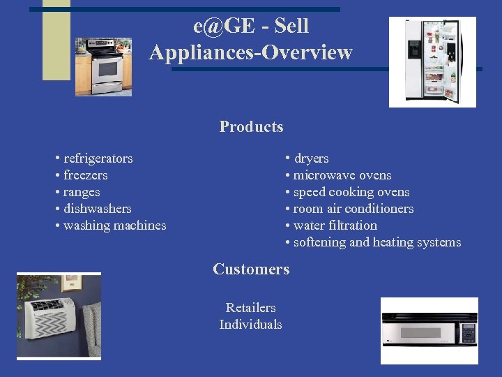 e@GE - Sell Appliances-Overview Products • refrigerators • freezers • ranges • dishwashers • washing machines • dryers • microwave ovens • speed cooking ovens • room air conditioners • water filtration • softening and heating systems Customers Retailers Individuals