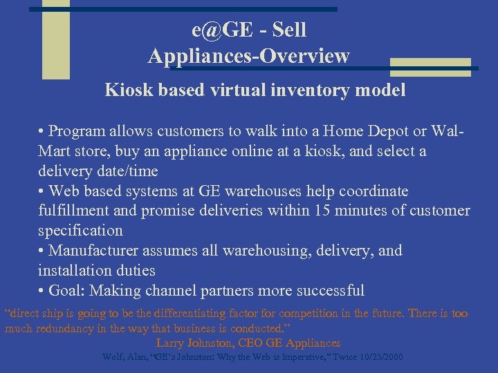 e@GE - Sell Appliances-Overview Kiosk based virtual inventory model • Program allows customers to walk into a Home Depot or Wal. Mart store, buy an appliance online at a kiosk, and select a delivery date/time • Web based systems at GE warehouses help coordinate fulfillment and promise deliveries within 15 minutes of customer specification • Manufacturer assumes all warehousing, delivery, and installation duties • Goal: Making channel partners more successful “direct ship is going to be the differentiating factor for competition in the future. There is too much redundancy in the way that business is conducted. ” Larry Johnston, CEO GE Appliances Wolf, Alan, “GE’s Johnston: Why the Web is Imperative, ” Twice 10/23/2000
