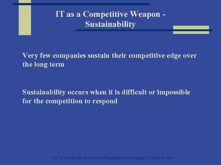 IT as a Competitive Weapon Sustainability Very few companies sustain their competitive edge over the long term Sustainability occurs when it is difficult or impossible for the competition to respond “IT as a Basis for Sustainable Competitive Advantage, ” Feeny & Ives