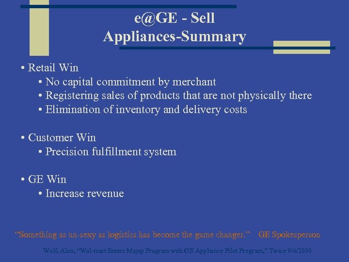 e@GE - Sell Appliances-Summary • Retail Win • No capital commitment by merchant • Registering sales of products that are not physically there • Elimination of inventory and delivery costs • Customer Win • Precision fulfillment system • GE Win • Increase revenue “Something as un-sexy as logistics has become the game changer. ” GE Spokesperson Wolf, Alan, “Wal-mart Enters Majap Program with GE Appliance Pilot Program, ” Twice 9/4/2000