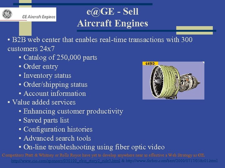 e@GE - Sell Aircraft Engines • B 2 B web center that enables real-time transactions with 300 customers 24 x 7 • Catalog of 250, 000 parts • Order entry • Inventory status • Order/shipping status • Account information • Value added services • Enhancing customer productivity • Saved parts list • Configuration histories • Advanced search tools • On-line troubleshooting using fiber optic video Competitors Pratt & Whitney or Rolls Royce have yet to develop anywhere near as effective a Web Strategy as GE. http: //www. cio. com/sponsors/050100_ebiz_story 2_side 5. html & http: //www. forbes. com/best/2000/0717/038 s 01. html