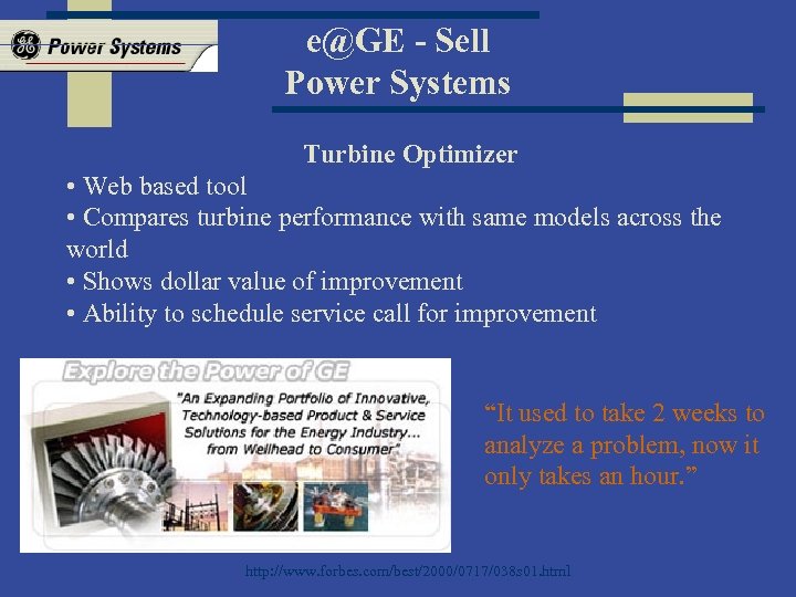 e@GE - Sell Power Systems Turbine Optimizer • Web based tool • Compares turbine performance with same models across the world • Shows dollar value of improvement • Ability to schedule service call for improvement “It used to take 2 weeks to analyze a problem, now it only takes an hour. ” http: //www. forbes. com/best/2000/0717/038 s 01. html