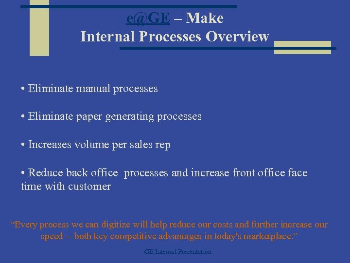 e@GE – Make Internal Processes Overview • Eliminate manual processes • Eliminate paper generating processes • Increases volume per sales rep • Reduce back office processes and increase front office face time with customer “Every process we can digitize will help reduce our costs and further increase our speed -- both key competitive advantages in today's marketplace. ” GE Internal Presentation