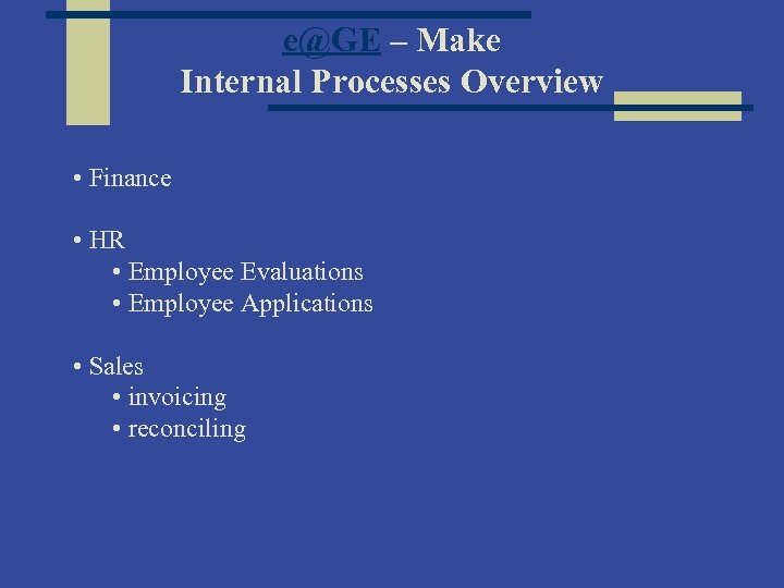 e@GE – Make Internal Processes Overview • Finance • HR • Employee Evaluations • Employee Applications • Sales • invoicing • reconciling