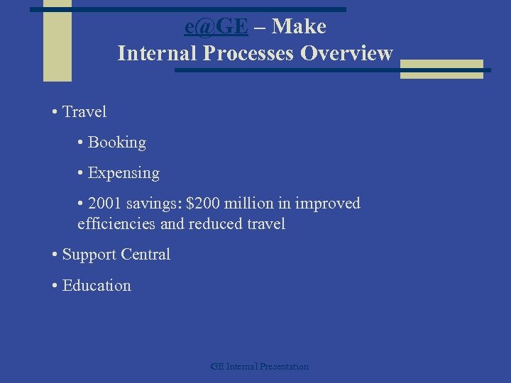 e@GE – Make Internal Processes Overview • Travel • Booking • Expensing • 2001 savings: $200 million in improved efficiencies and reduced travel • Support Central • Education GE Internal Presentation