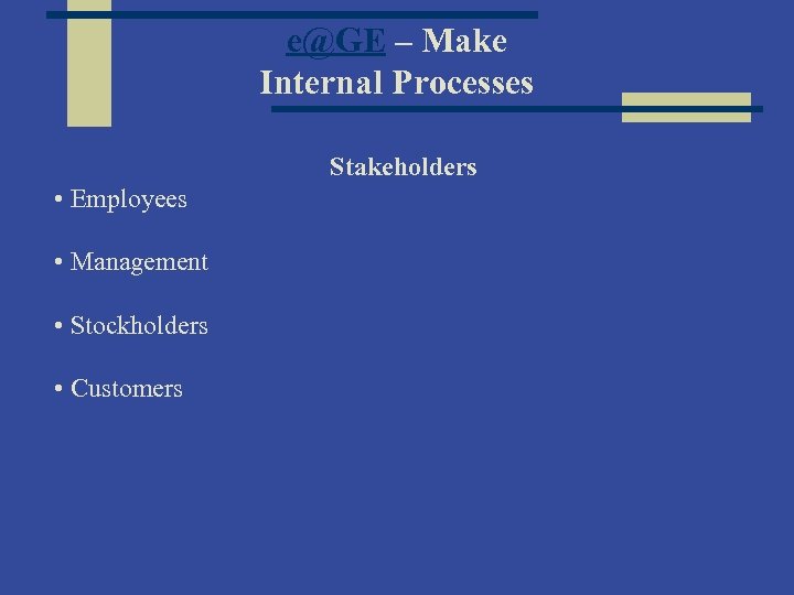 e@GE – Make Internal Processes Stakeholders • Employees • Management • Stockholders • Customers