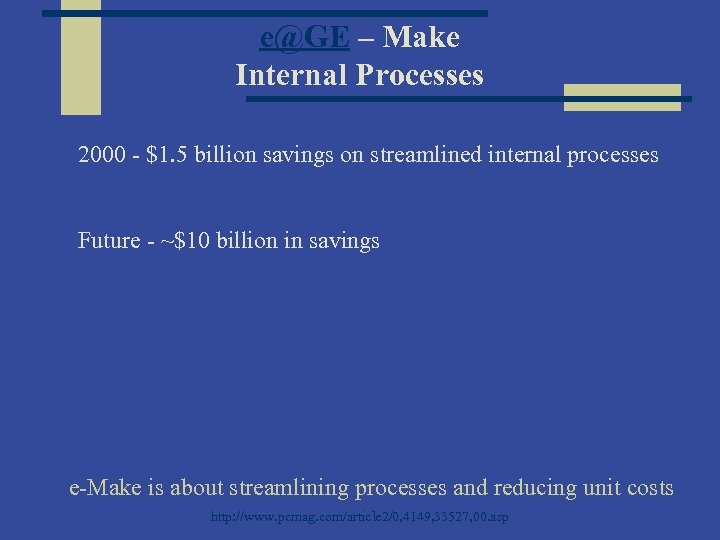 e@GE – Make Internal Processes 2000 - $1. 5 billion savings on streamlined internal processes Future - ~$10 billion in savings e-Make is about streamlining processes and reducing unit costs http: //www. pcmag. com/article 2/0, 4149, 33527, 00. asp