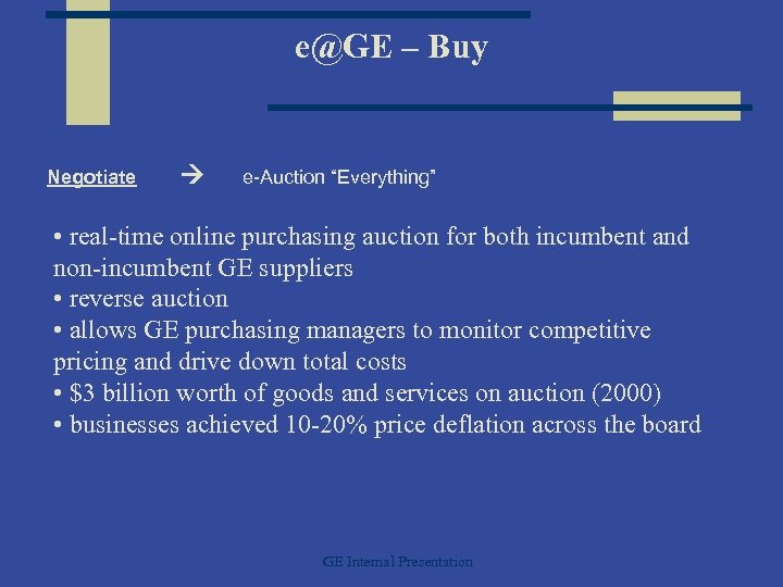 e@GE – Buy Negotiate e-Auction “Everything” • real-time online purchasing auction for both incumbent and non-incumbent GE suppliers • reverse auction • allows GE purchasing managers to monitor competitive pricing and drive down total costs • $3 billion worth of goods and services on auction (2000) • businesses achieved 10 -20% price deflation across the board GE Internal Presentation