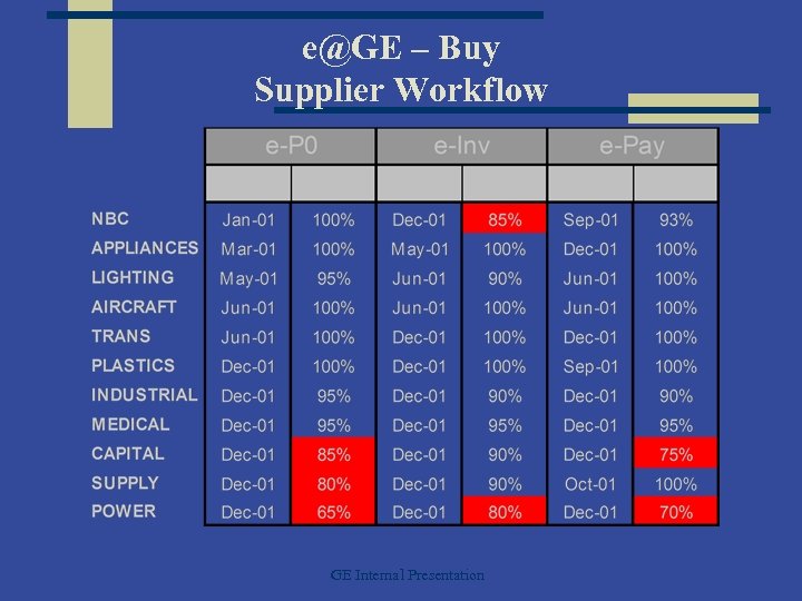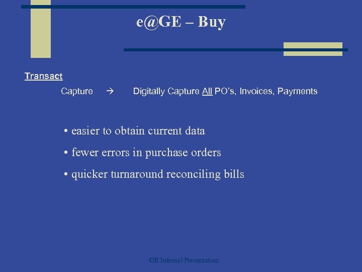 e@GE – Buy Transact Capture Digitally Capture All PO’s, Invoices, Payments • easier to obtain current data • fewer errors in purchase orders • quicker turnaround reconciling bills GE Internal Presentation