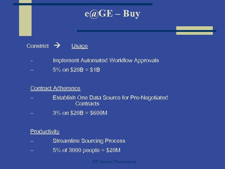 e@GE – Buy Constrict Usage – Implement Automated Workflow Approvals – 5% on $20 B = $1 B Contract Adherence – Establish One Data Source for Pre-Negotiated Contracts – 3% on $20 B = $600 M Productivity – Streamline Sourcing Process – 5% of 3000 people = $20 M GE Internal Presentation