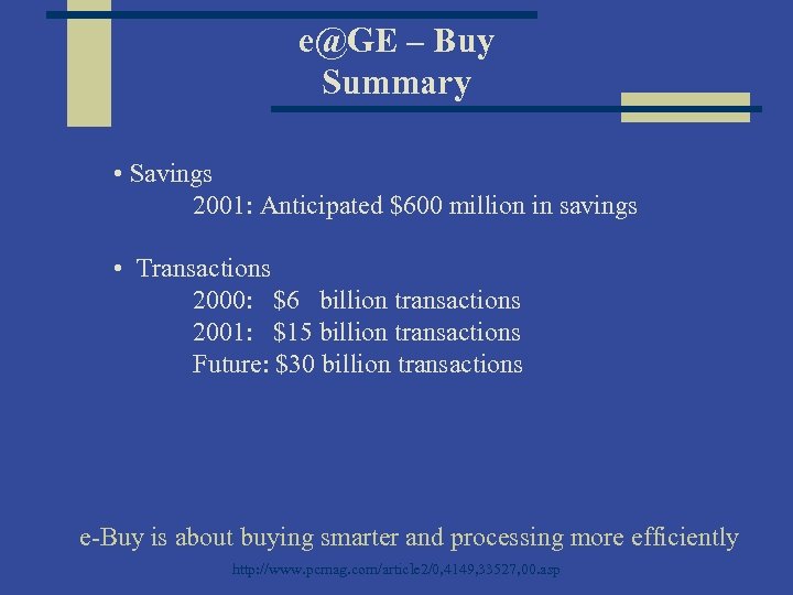 e@GE – Buy Summary • Savings 2001: Anticipated $600 million in savings • Transactions 2000: $6 billion transactions 2001: $15 billion transactions Future: $30 billion transactions e-Buy is about buying smarter and processing more efficiently http: //www. pcmag. com/article 2/0, 4149, 33527, 00. asp