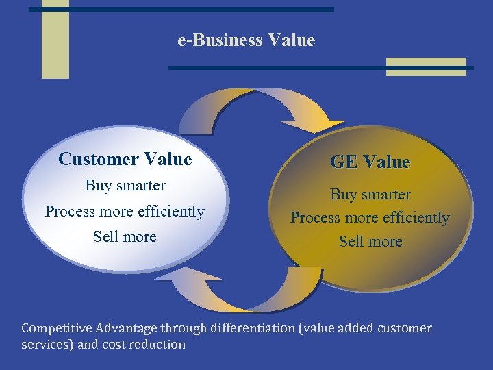 e-Business Value Customer Value Buy smarter Process more efficiently Sell more GE Value Buy smarter Process more efficiently Sell more Competitive Advantage through differentiation (value added customer services) and cost reduction