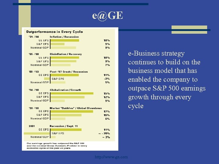 e@GE e-Business strategy continues to build on the business model that has enabled the company to outpace S&P 500 earnings growth through every cycle http: //www. ge. com