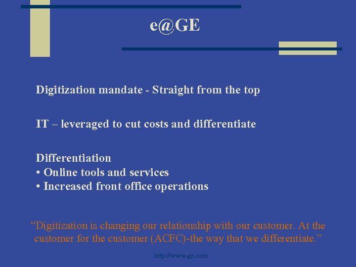 e@GE Digitization mandate - Straight from the top IT – leveraged to cut costs and differentiate Differentiation • Online tools and services • Increased front office operations “Digitization is changing our relationship with our customer. At the customer for the customer (ACFC)-the way that we differentiate. ” http: //www. ge. com