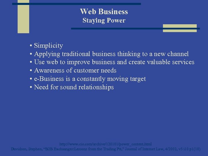 Web Business Staying Power • Simplicity • Applying traditional business thinking to a new channel • Use web to improve business and create valuable services • Awareness of customer needs • e-Business is a constantly moving target • Need for sound relationships http: //www. cio. com/archive/120101/power_content. html Davidson, Stephen, “B 2 B Exchaanges: Lessons from the Trading Pit, ” Journal of Internet Law, 4/2002, v 5 i 10 p 1(10)