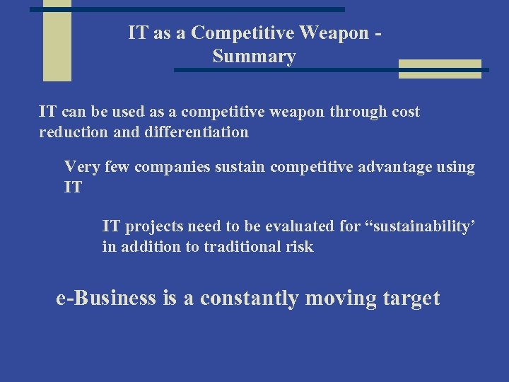 IT as a Competitive Weapon Summary IT can be used as a competitive weapon through cost reduction and differentiation Very few companies sustain competitive advantage using IT IT projects need to be evaluated for “sustainability’ in addition to traditional risk e-Business is a constantly moving target