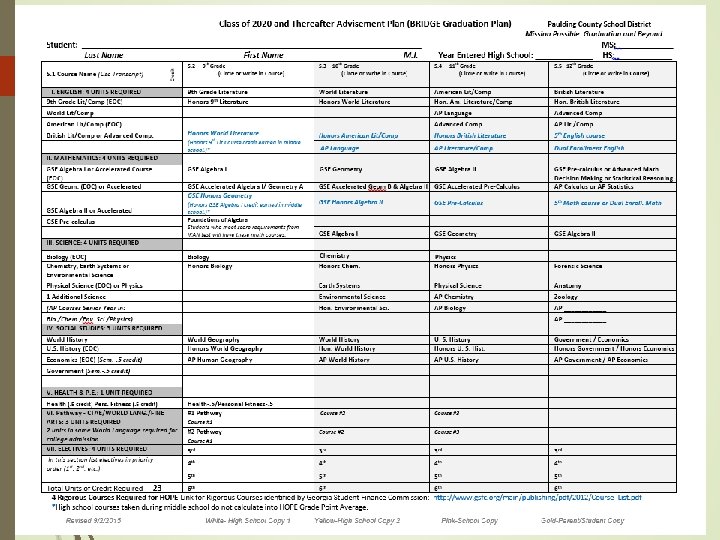 BRIDGE Graduation Plan Advisement Opportunities HS Counselors visited and completed classroom guidance in early November. Course advisement was completed in academic classes on November 20 th with teachers and counselors. We have created an Individual Graduation Plan for each student. Tonight, we are providing an overview of HS requirements. ALL of this information can be found in HS 101 and in the Career Planner on the Paulding County School District Website.