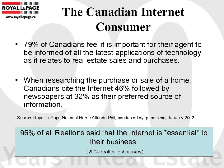 The Canadian Internet Consumer • 79% of Canadians feel it is important for their agent to be informed of all the latest applications of technology as it relates to real estate sales and purchases. • When researching the purchase or sale of a home, Canadians cite the Internet 46% followed by newspapers at 32% as their preferred source of information. Source: Royal Le. Page National Home Attitude Poll, conducted by Ipsos Reid, January 2002 96% of all Realtor’s said that the Internet is *essential* to their business. (2004 realtor tech survey)