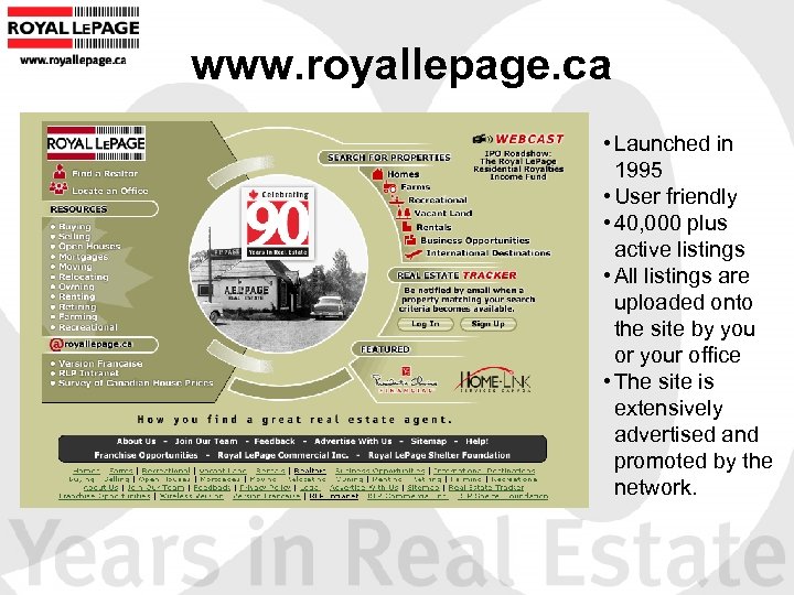 www. royallepage. ca • Launched in 1995 • User friendly • 40, 000 plus active listings • All listings are uploaded onto the site by you or your office • The site is extensively advertised and promoted by the network.