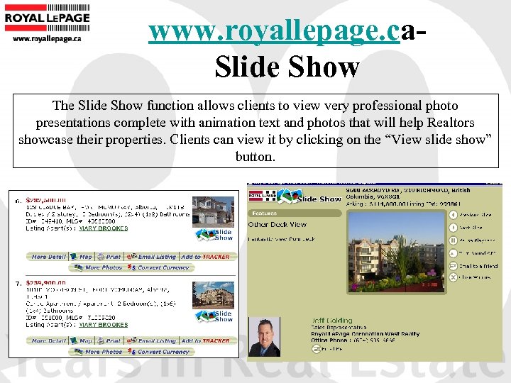 www. royallepage. ca. Slide Show The Slide Show function allows clients to view very professional photo presentations complete with animation text and photos that will help Realtors showcase their properties. Clients can view it by clicking on the “View slide show” button.