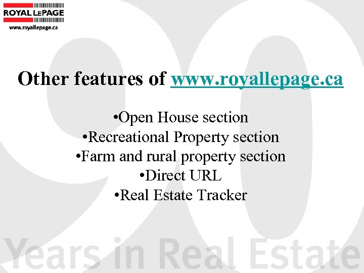 Other features of www. royallepage. ca • Open House section • Recreational Property section • Farm and rural property section • Direct URL • Real Estate Tracker