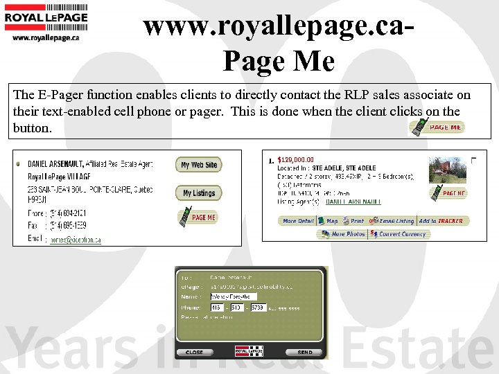 www. royallepage. ca. Page Me The E-Pager function enables clients to directly contact the RLP sales associate on their text-enabled cell phone or pager. This is done when the client clicks on the button.